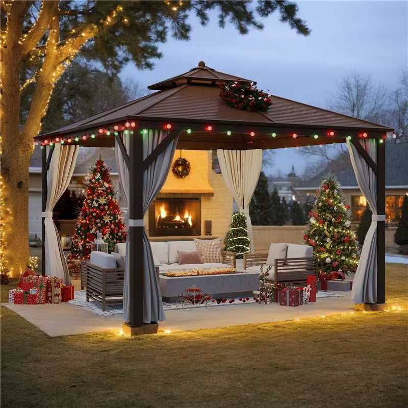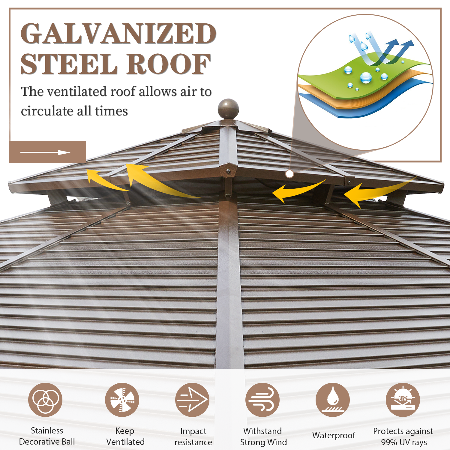- 【GALVANIZED STEEL ROOF】- Beautiful hard metal top instead of normal fabric or polycarbonate material.Compare to a traditional soft top,this kind of gazebo roof is strong enough to withhold any heavy snow and offer unbeatable stability in windy conditions.