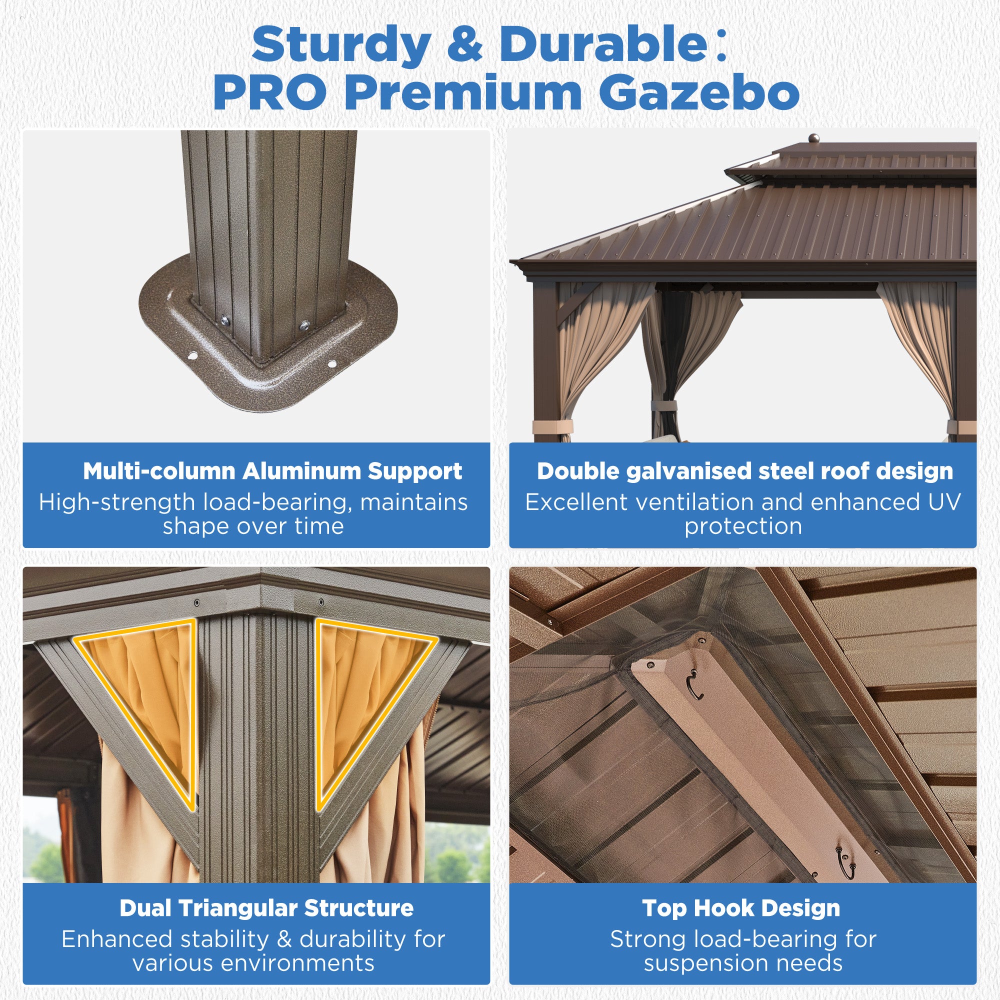 - 【RUSTPROOF ALUMINUM FRAME】- Sturdy powder-coated rust-resistant hardtop gazebo frame, very stable and sturdy, built with 4.7"x4.7" triangular aluminum stand pole, much bigger and stronger than standard models.All materials are built to last,never becoming rusty or deformed.