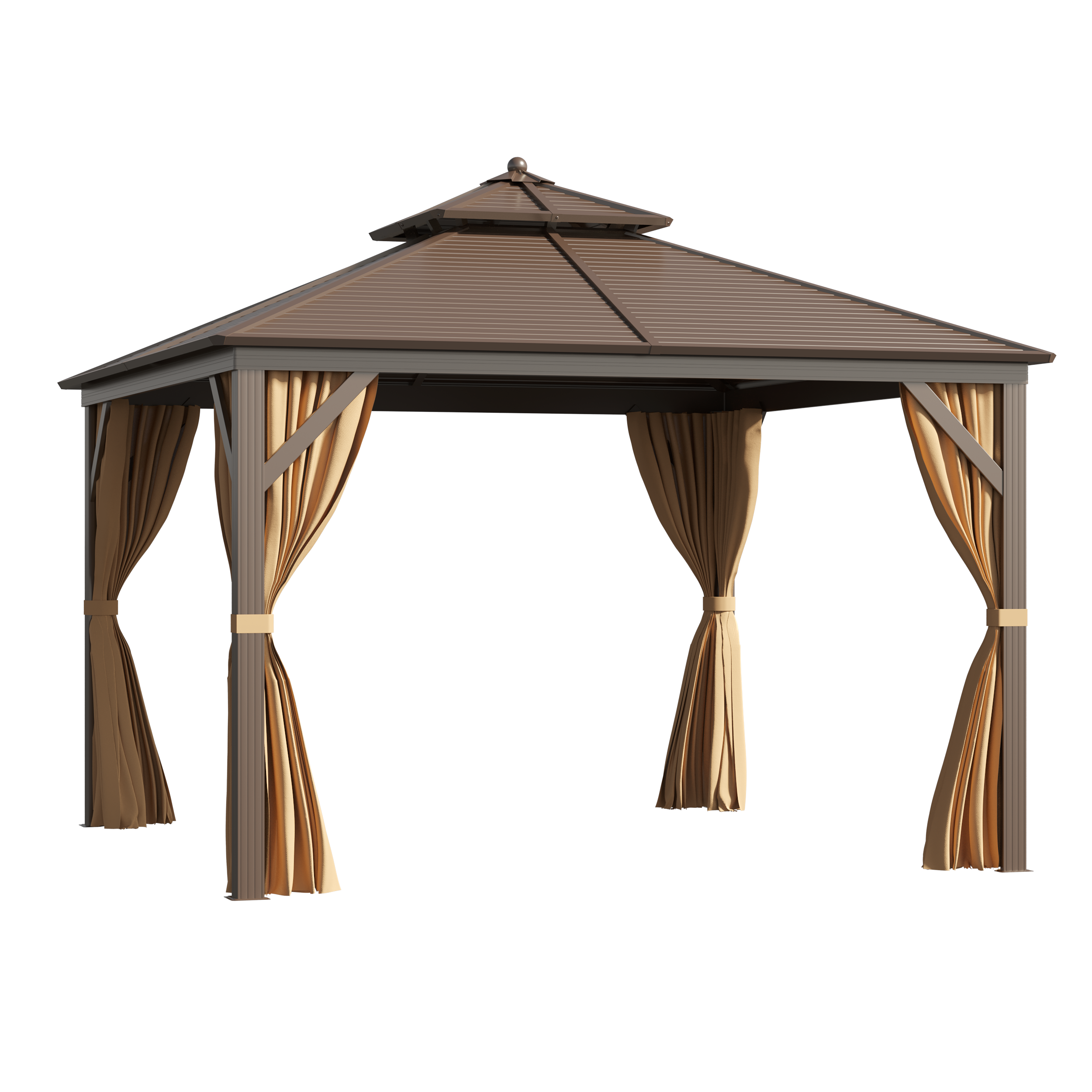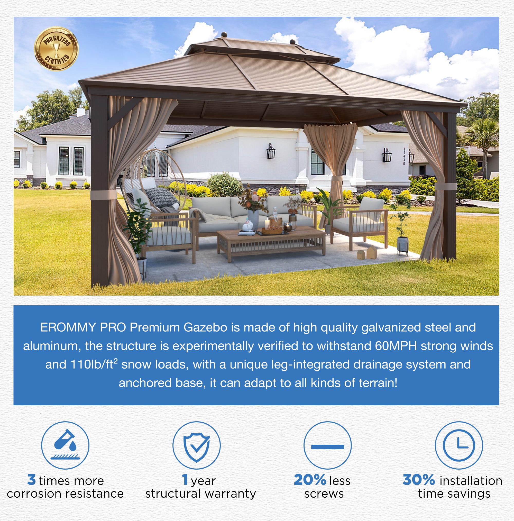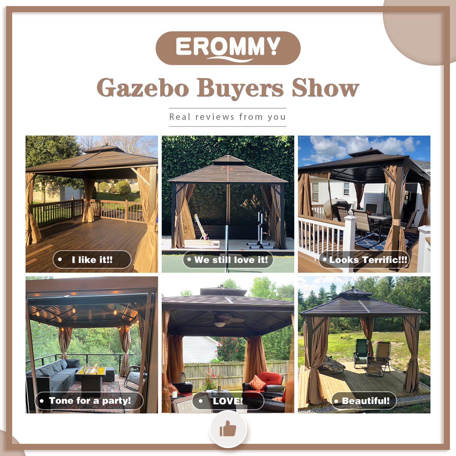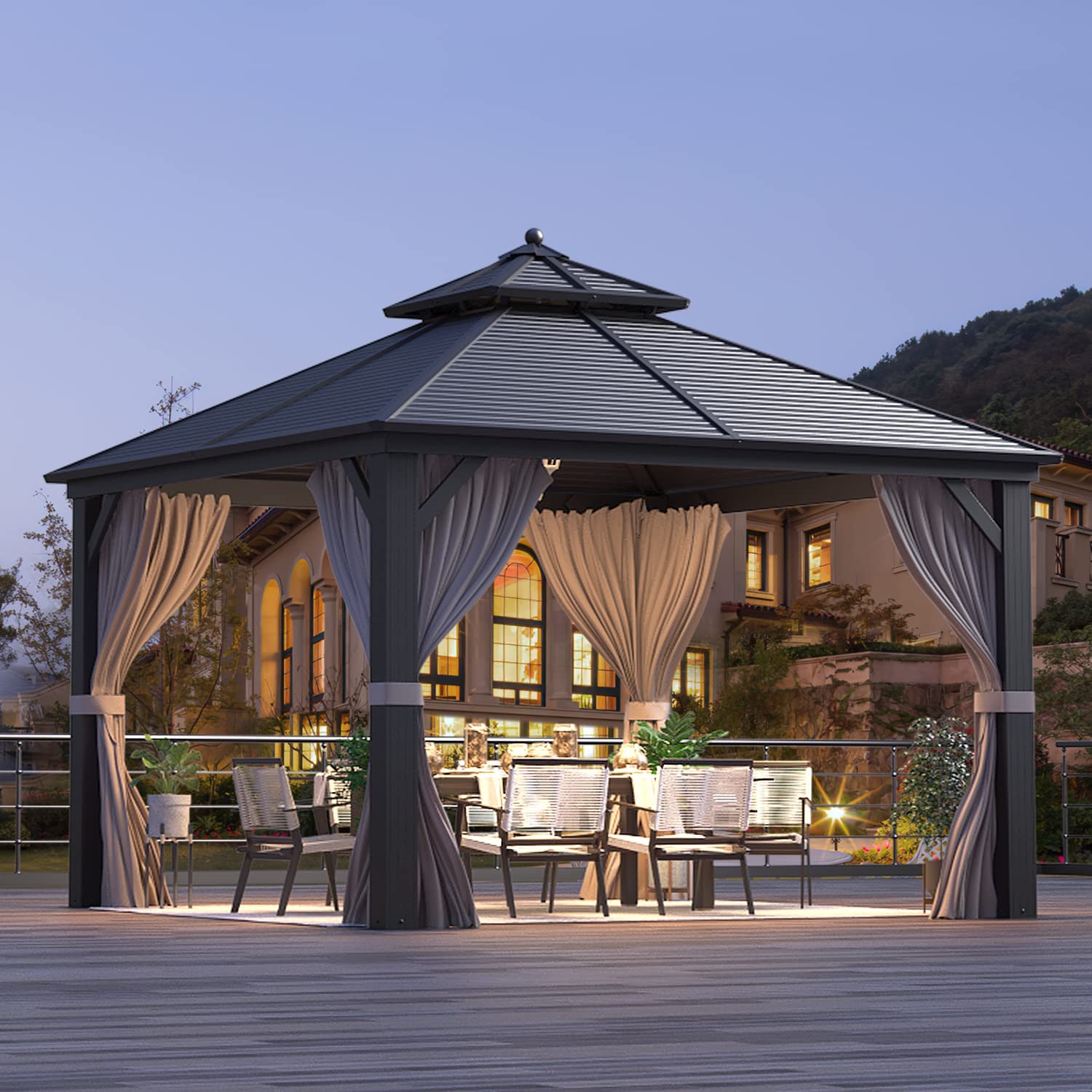 - 【DOUBLE TOPS DESIGN】- Outdoor gazebo has ventilated double tops provide safety from harmful UV rays while the unique design allows wind to pass through.Hardtop gazebos for patios can tolerate high summer temperatures and withstand UV rays,provides you plenty of cool shade to enjoyment.