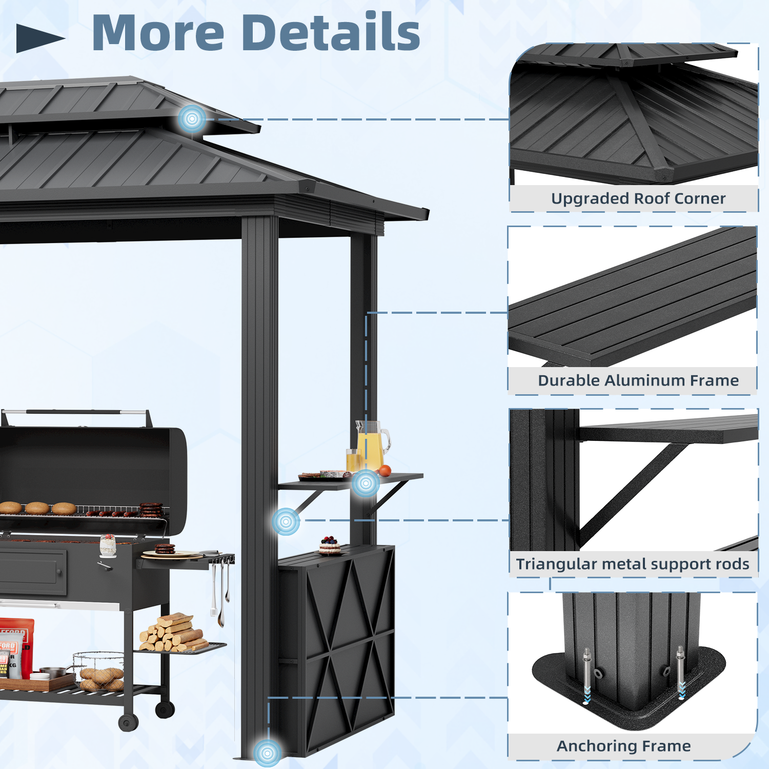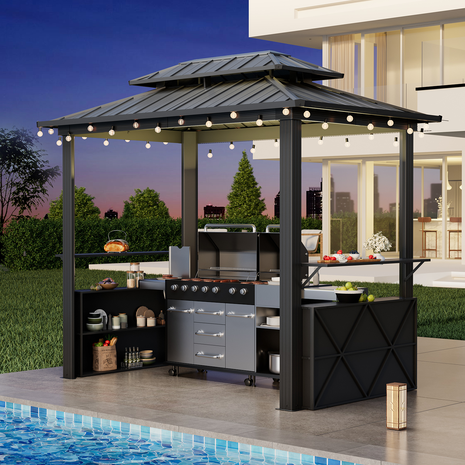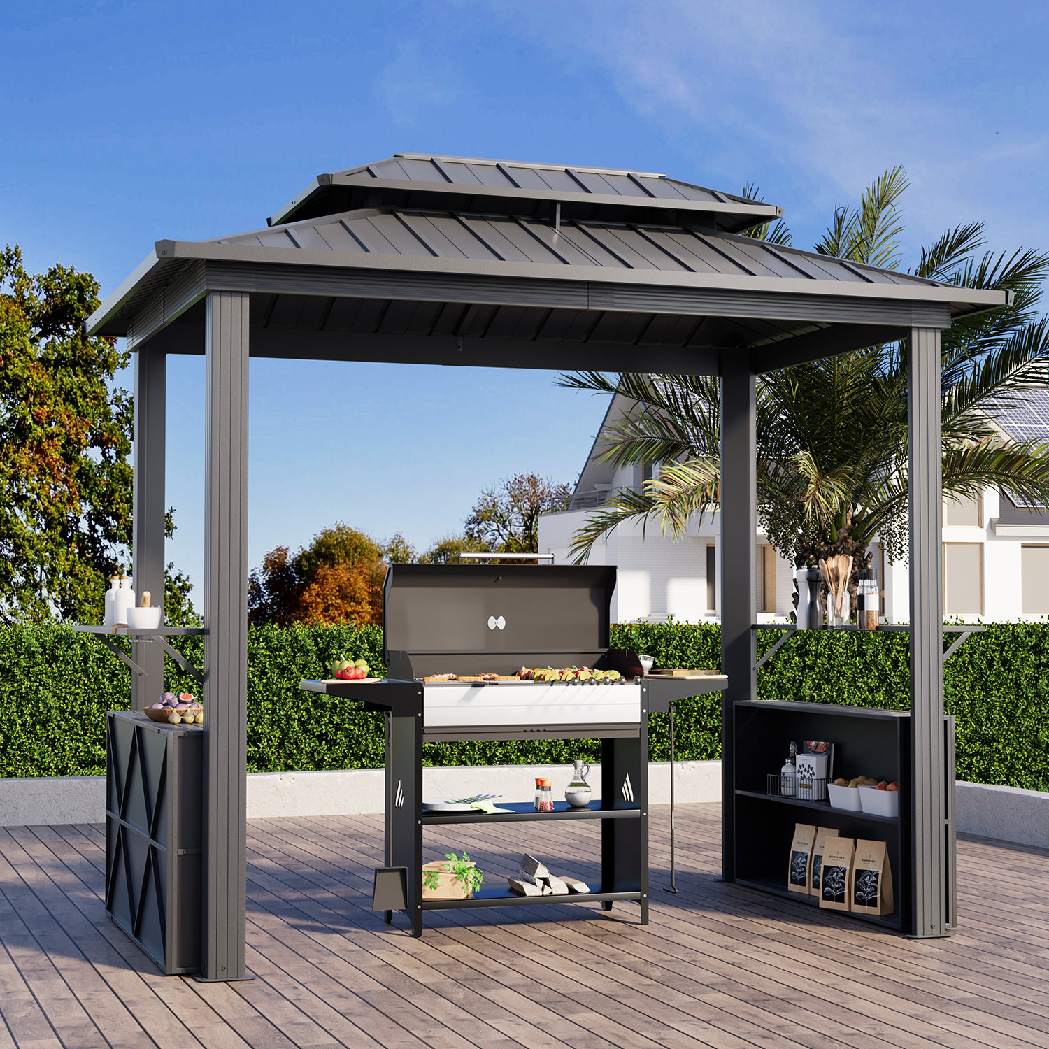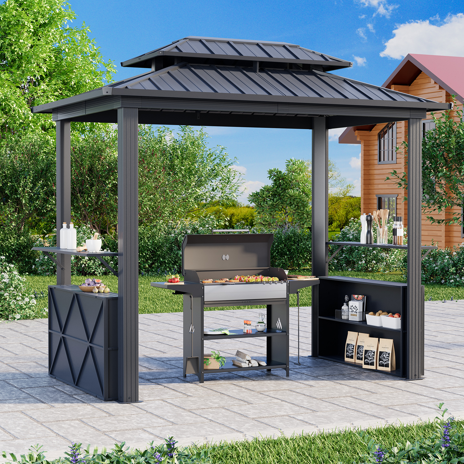 The star feature is the two-layer galvanized steel roof. This outdoor grill shelter can be used in any season and any weather condition with its hardtop double roof. It can shade you on sunny days and shelter you from drizzle and snow. The vented design (with a gap between the layers) lets hot air and barbecue smoke escape upwards, so cooking odors don’t get trapped under the roof.