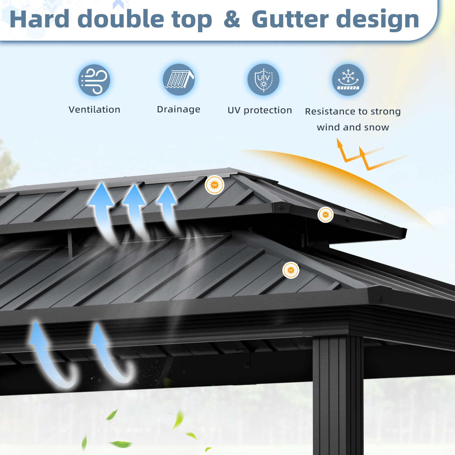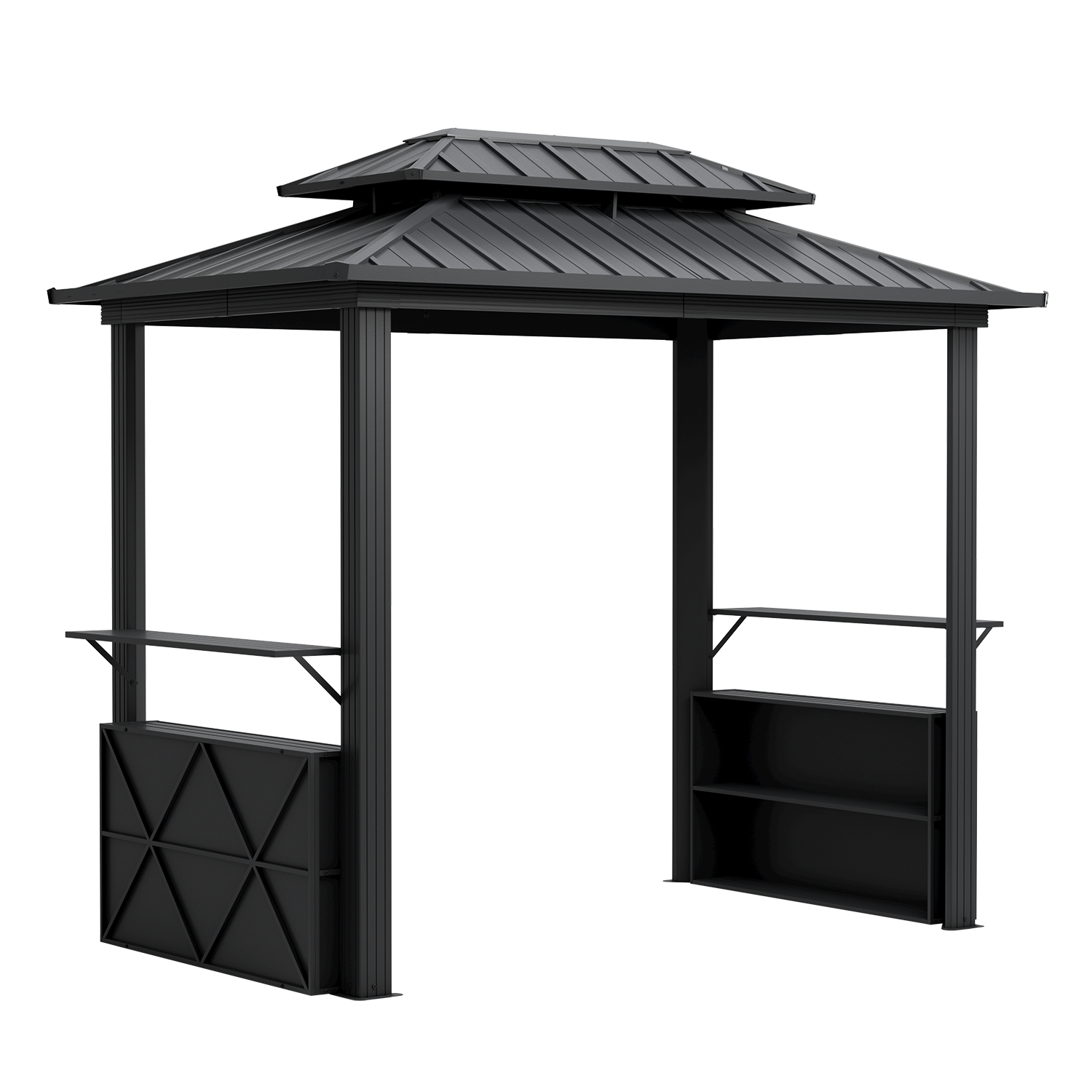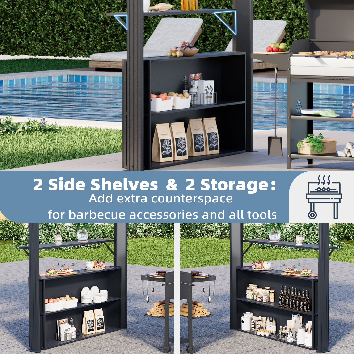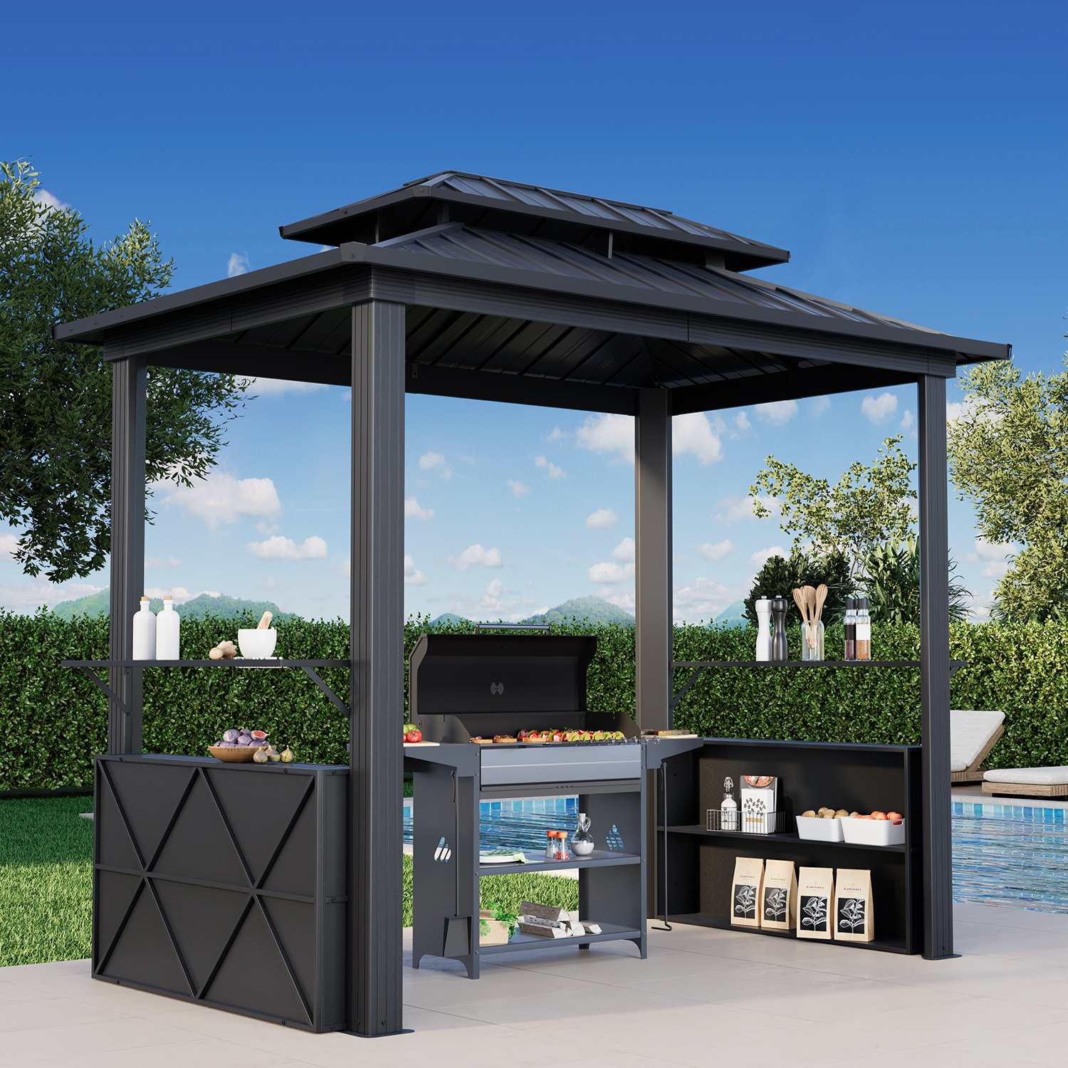 The star feature is the two-layer galvanized steel roof. This outdoor grill shelter can be used in any season and any weather condition with its hardtop double roof. It can shade you on sunny days and shelter you from drizzle and snow. The vented design (with a gap between the layers) lets hot air and barbecue smoke escape upwards, so cooking odors don’t get trapped under the roof.