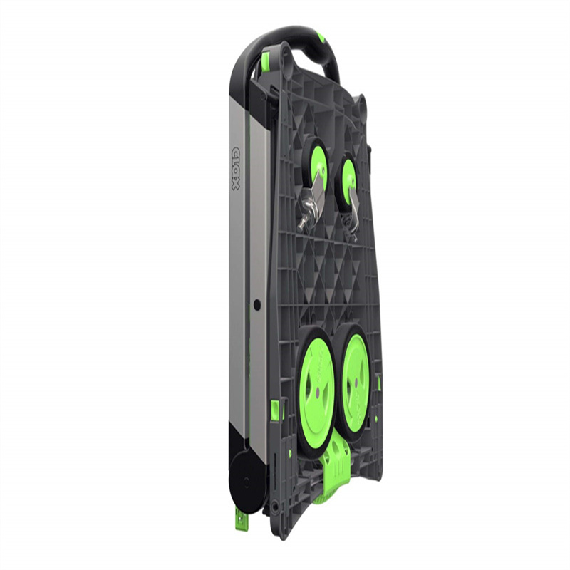 The� consists of aluminium and high-quality synthetics. Just by pushing a single button it can be folded or unfolded within seconds. Folded up, it can be easily carried or stored away in a practical manner. As the upper loading area is approx. 130掳 foldable upwards, it allows for the transport of higher goods on the lower level.