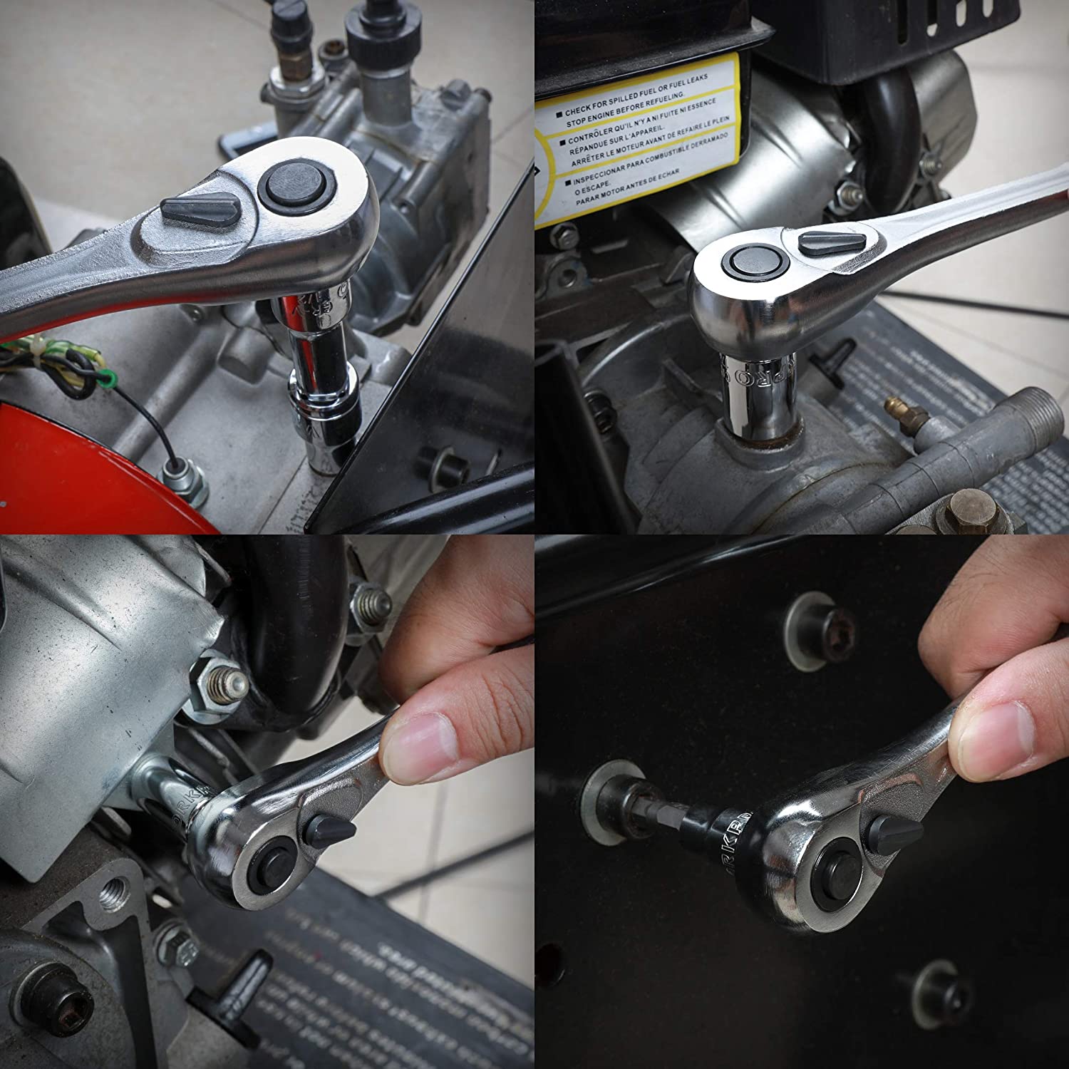 - 1/4", 3/8", and 1/2" quick-release ratchets feature 45-tooth fine gearing, providing an 8掳 arc turn