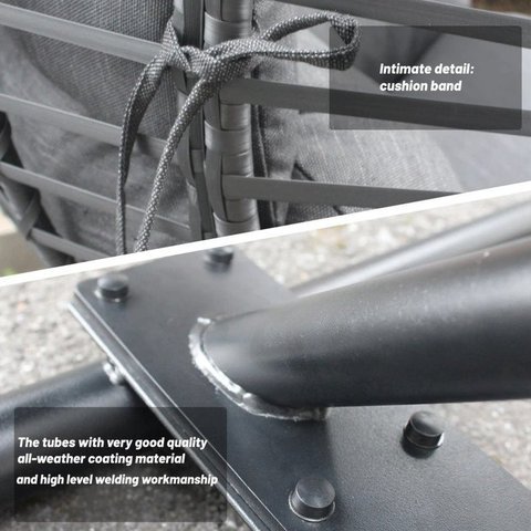 Qualified Material- Use better strength cold-rolled tube, the thickness of the main tubes are above 3.0mm to 10mm; UV protected polyethylene resin rattan wrapped, featuring strength and durability, weather resistant, corrosion resistant, odourless and easy to cleanup;10�� thickness soft cushion with high density foam, soft and comfortable; 230g/m2 high quality olefin fabric;