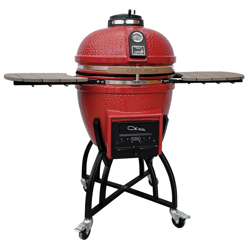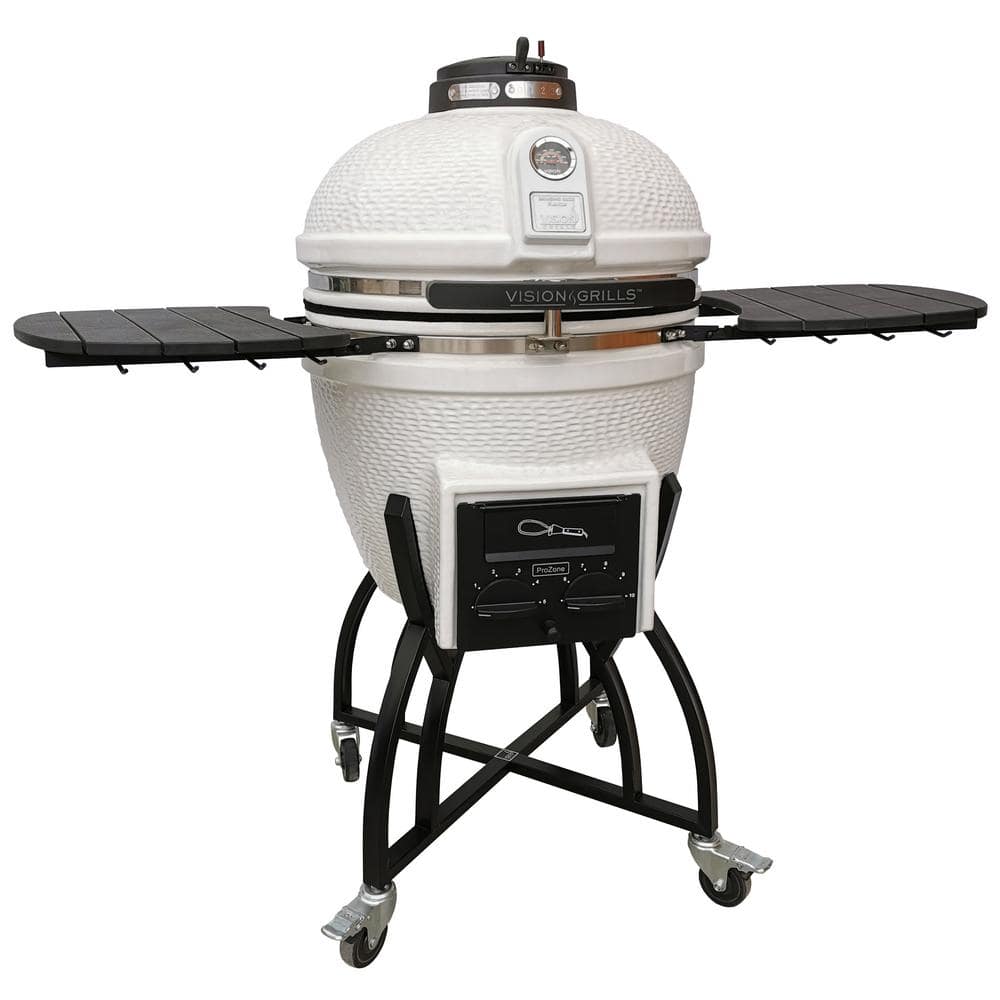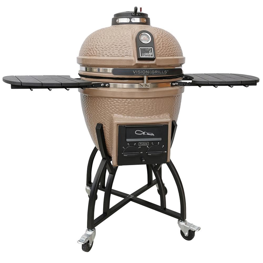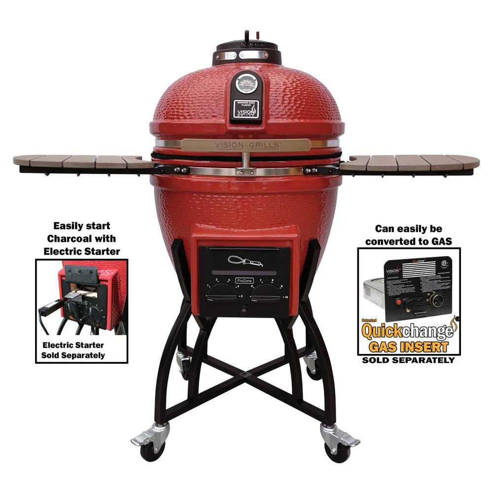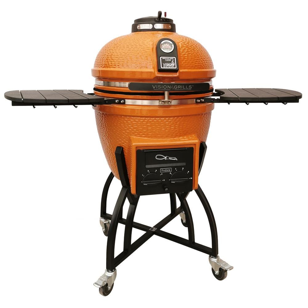 Experience the ultimate in grill versatility with the Vision Grills Kamado Pro Ceramic Charcoal Grill. It replicates wood oven cooking, allowing you to grill, sear and smoke meats and vegetables as well as bake pizzas and bread. An electric starter port lets you light the grill with ease. Dual calibrated draft vents provide perfect temperature control and a removable ash drawer makes for easy cleaning. This high-quality ceramic grill offers 604 sq. in. of cooking space and 2-tiered stainless steel flip grates. Additional features include a cast iron calibrated top vent, two solid-surface drop-down shelves and a full-length vinyl cover for durable protection.