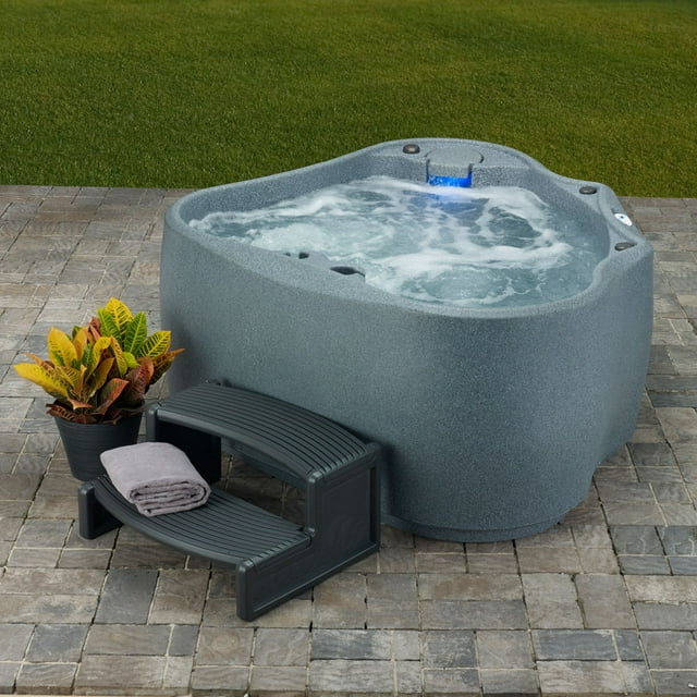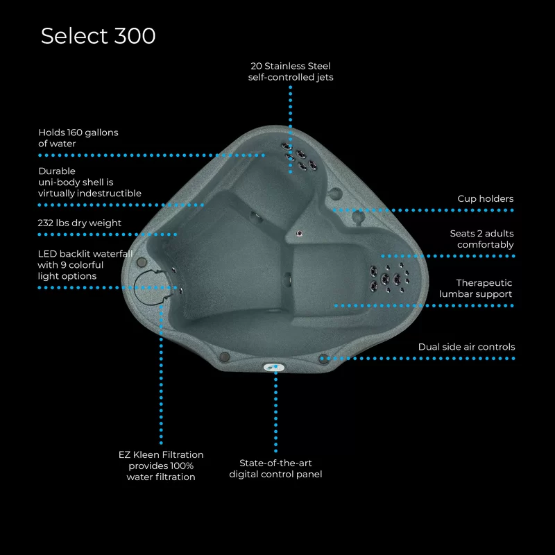 The AR-300 Select by AquaRest Spas is a large 2-person hot tub with 20 two-tone stainless-steel jets, including soothing foot massage jets, powered by a 1.5hp Jacuzzi pump. Enjoy the ambiance created with the patented LED backlit waterfall with 9 color settings and 2 deep cup holders. Relax knowing that every AquaRest Spa includes an ASTM-certified locking safety cover and full foam insulation, keeping the leaves and debris out of the heat inside of your hot tub, making it incredibly energy efficient, meeting the strict California Energy Commission (CEC) standards. AquaRest Spas are manufactured using state-of-the-art roto molding technology, producing an extremely durable and unbelievably portable hot tub, resistant to all types of weather and weighing in at only 232 lbs. Spend more time enjoying and less time maintaining your tub with the patented AquaRest Easy Kleen 100% filtration system. The AR-300 follows the ��Simple, Portable, Durable, and Affordable�� philosophy that has helped AquaRest Spas become the #1 online hot tub manufacturer. Residential delivery and factory warranty included. Proudly Made in the USA! - 68" x 67" x 31" - 232 lbs - 160 Gallons - 20 stainless steel jets, including 2 for your feet - 120-volt Plug-n-Play electrical - Digital Control - Jacuzzi 1.5HP pump - Patented LED backlit waterfall with 9 color settings - Patented Easy Kleen 100% water filtration system