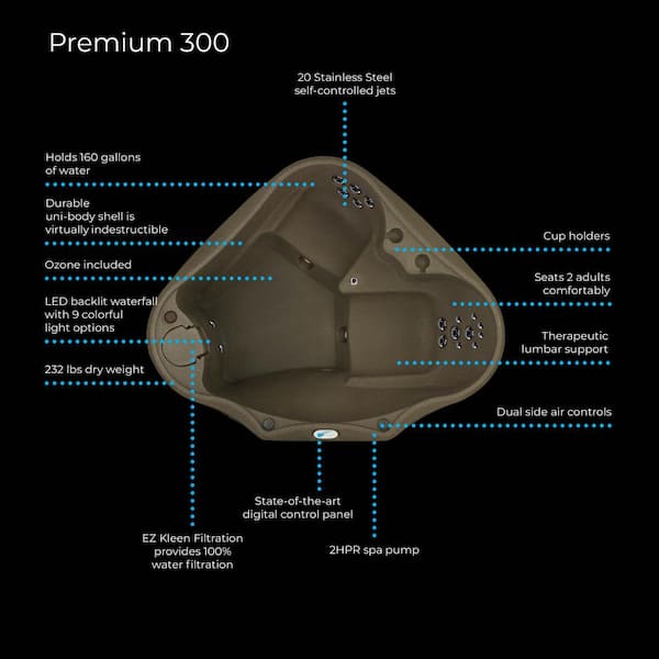 The AR-300 Premium includes an impressive, upgraded package grouping 20 Stainless Steel Hydrotherapy Jets, Ozone and 2 HPR 2 speed pump. Finally, a REAL spa, with REAL therapeutic benefits at a price that is equally relaxing. Best of all, it's still 120-Volt/15 Amp, so simply fill it up, plug it in and relax knowing your spa is using less energy with full foam insulation. This spa is outstanding in comfort, value and quality comparable to other spas, but at a fraction of the cost. Soothing high performing hydrotherapy is delivered through 20 Stainless Steel Jets with dual side air controls giving you full therapeutic control. Your Massage, Your Way. The therapeutic lumbar arch support alleviates achy backs and the multi-level jet placement targets your muscles just right. Take relaxation to a whole new level with patented multi-color LED backlit cascading waterfall with 9 colorful light settings to help create the perfect ambiance. The EZ Kleen Filtration System, providing 100% water filtration, combined with a factory installed Ozone Purification System, which eliminates up to 75% of chemicals, work together to keep the water crisp and clean. At 232 lbs., it's easily portable too. The spa can be converted from a 120-Volt/ 1kW to 240-Volt/4kW with the installation on a 240-Volt/30or50 Amp electrical service. Install on any solid flat level surface capable of handling specified load. So relax and enjoy this affordable, comfortable spa without breaking the budget.