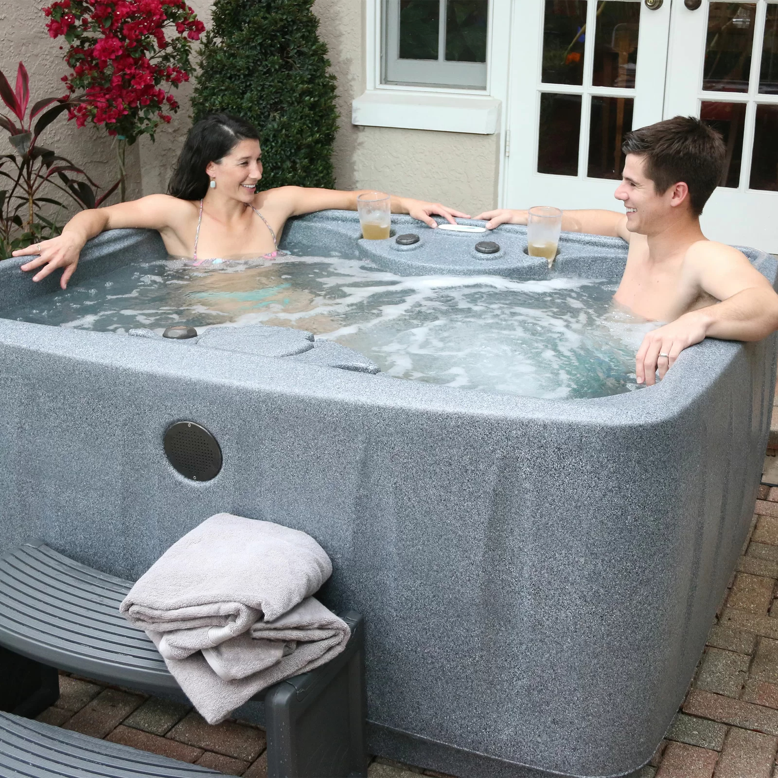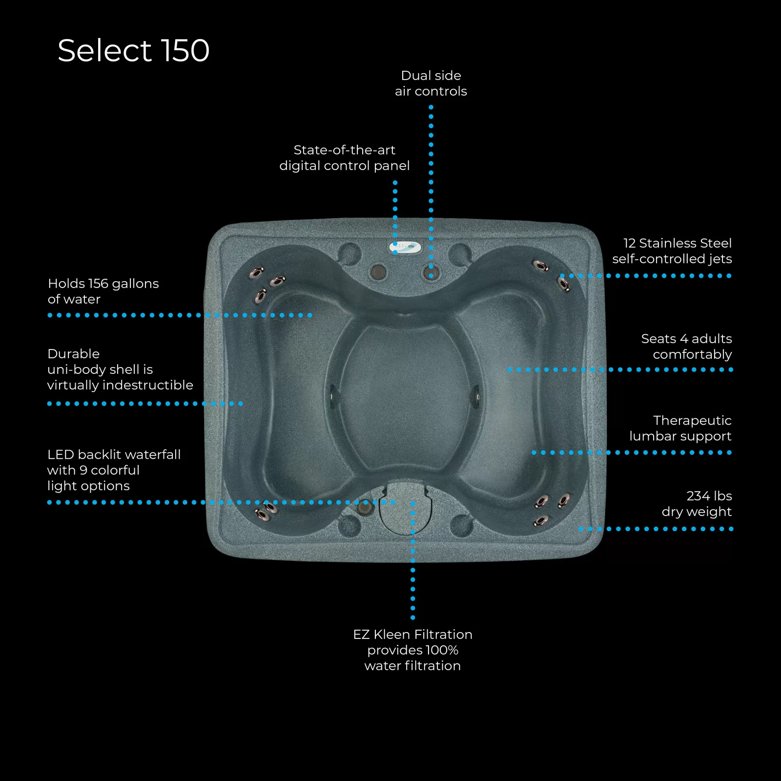 The AquaRest AR-150 Select packs a fully customizable massage powered by a 1.5hp Jacuzzi brand pump into a comfortable 4-person hot tub. 12 multi-level stainless steel jets provide pinpoint massages to different muscle groups, providing therapeutic and relaxing hydrotherapy. The AR-150 Select is manufactured using state-of-the-art roto molding technology that produces a super durable and unbelievably portable hot tub, resistant to all weather types and weighing in at only 234 lbs. Create the perfect ambiance for any setting with the patented LED backlit waterfall with 9 different color settings and the 4 deep cup holders. Ease your mind knowing that your AR-150 Select comes with an ASTM-certified locking safety cover, keeping the leaves and debris out of the heat inside of your hot tub, making it extremely energy efficient. Reduce your use of harsh chemicals with the AquaRest patented Easy Kleen 100% water filtration system, ensuring that all your water passes through the filtration system. Installation is a cinch with the 120-volt 15-amp plug-n-play setup, including a 12-foot GFCI cord. The AR-150 Select follows the "Simple, Portable, Durable, and Affordable" philosophy that has helped AquaRest spas become the #1 hot manufacturer online. Free residential delivery and factory warranty are included. Proudly Made in the U.S.A.