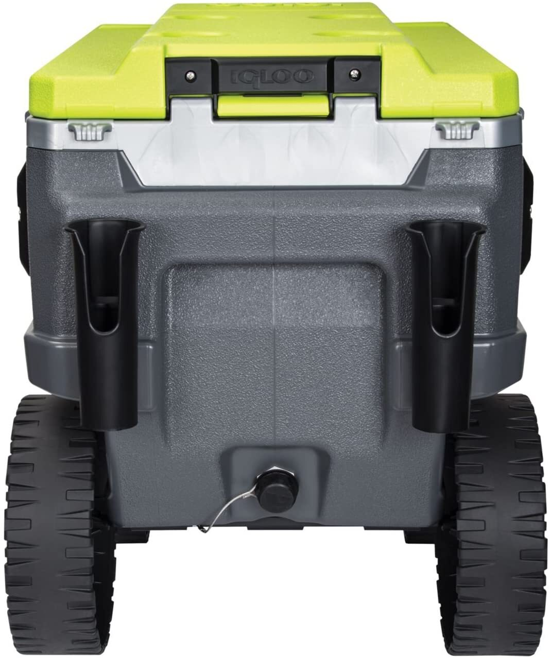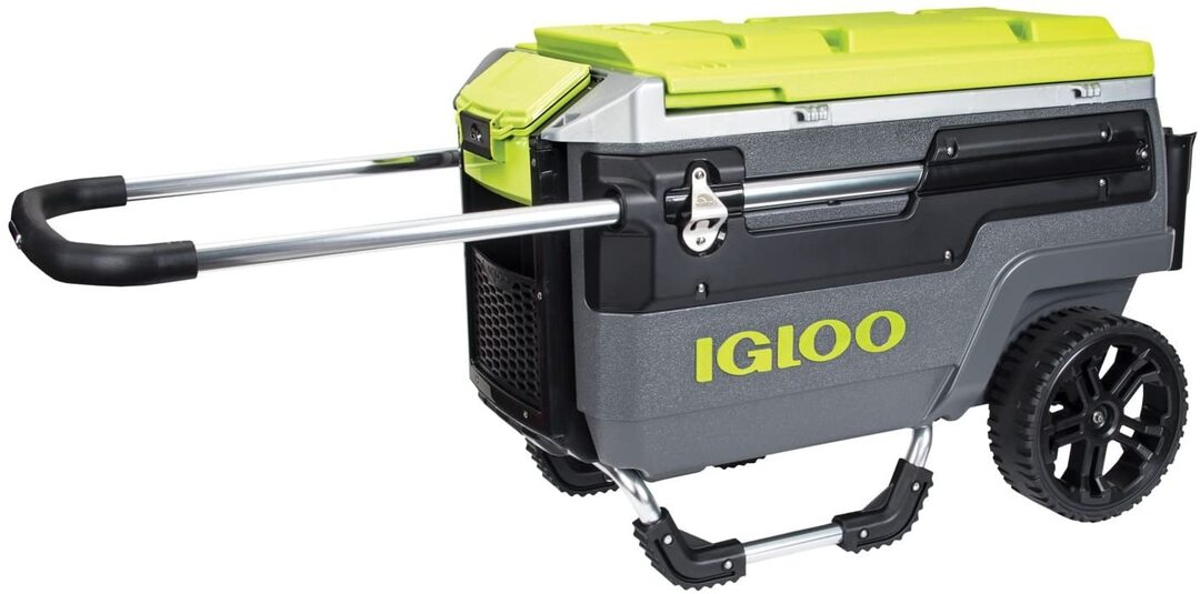 When traversing grassy fields to beach dunes or dirt roads to wooded trails-wherever your heart desires, the Igloo Trailmate will get there with ease and be the life of the part day or night. Ultratherm insulated body and lid provide 4-day ice retention performance. Butler tray utilizes the telescoping handle for serving snacks and drinks, and it stores under the lid when not in use. Two bottle openers are at your fingertips when you're ready to enjoy another refreshment. Oversized 10 inch never-flat wheels tackle Sand and other challenging terrain with superior traction and ease. Self-draining cup holders keep your cold ones in arm's reach.