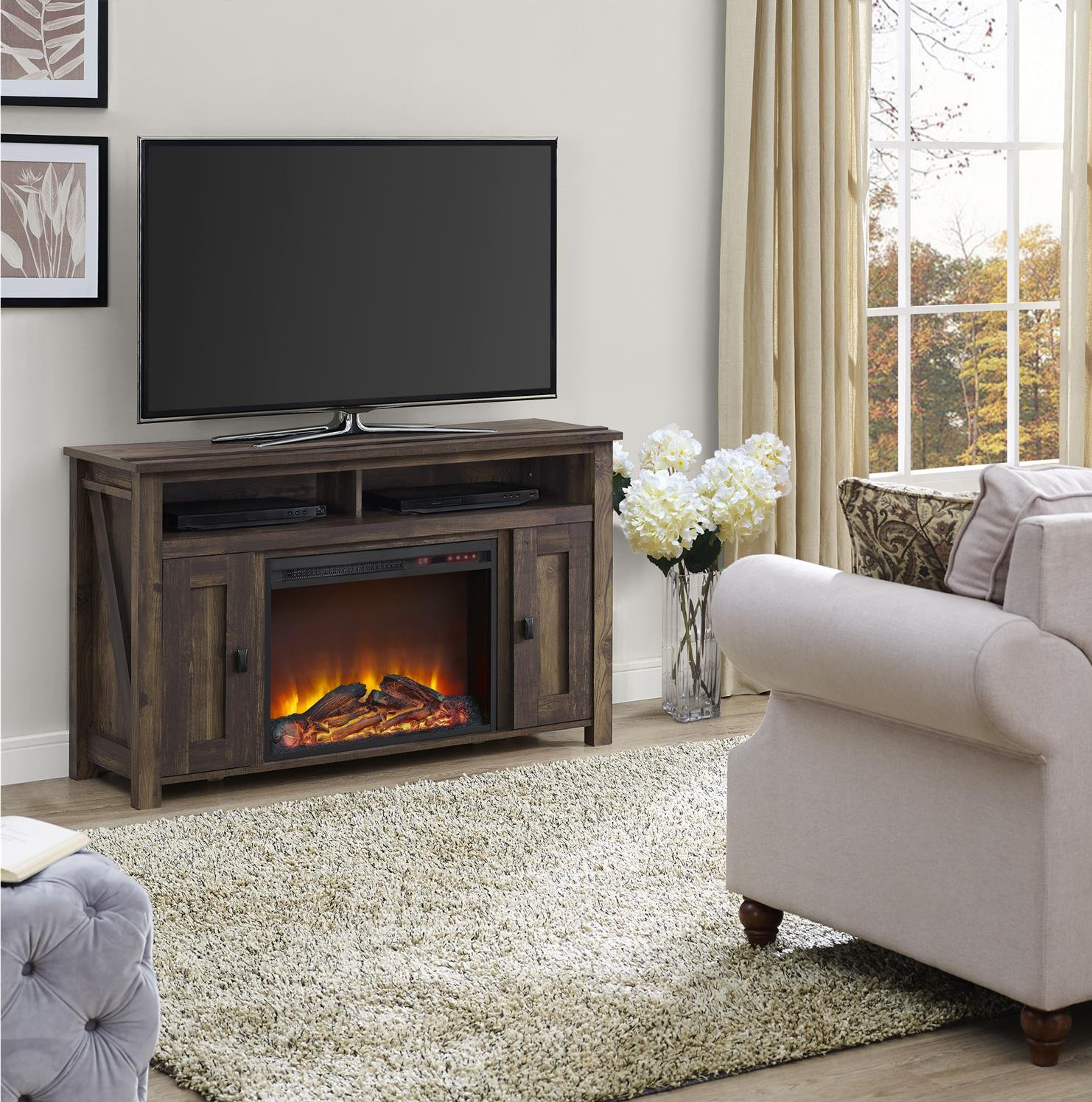 - The Electric Fireplace TV Cabinet has a rustic look for a 70-inch wide or 65-pound TV that brings the outdoors inside.
