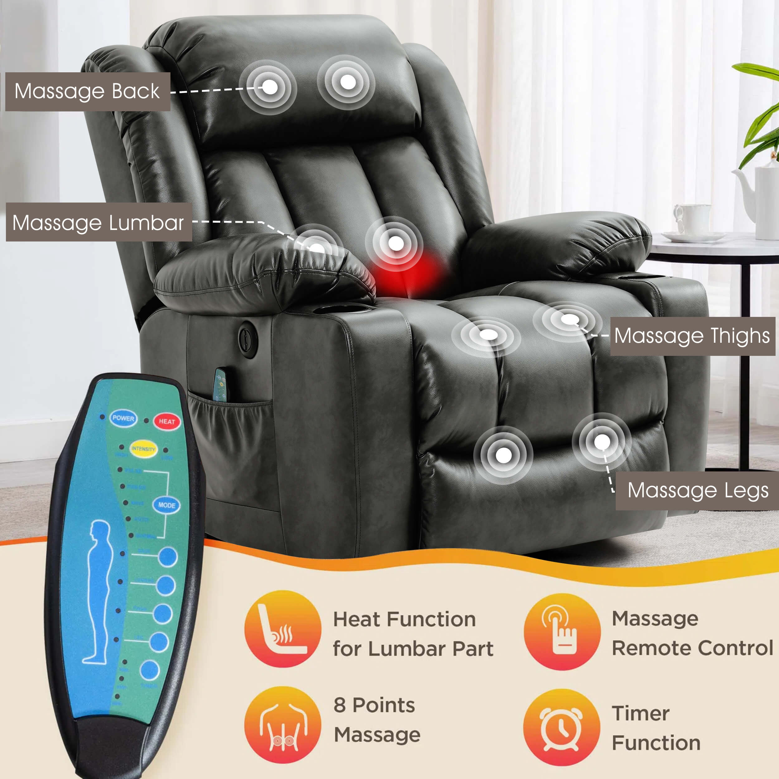 - [Full Body Massage with Heating] This electric chair features an advanced 8 points massage system that targets your back, lumbar, thighs and legs. With 5 adjustable modes and 2 intensity options, you can enjoy a personalized full-body massage experience at home. The lumbar heating function helps reduce stress and fatigue by reducing pressure and blood circulation in the lumbar.