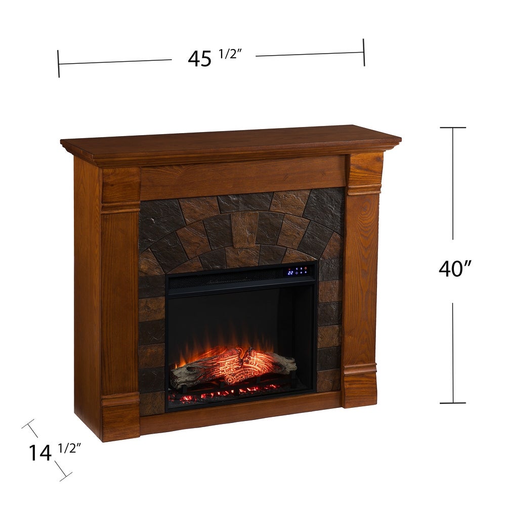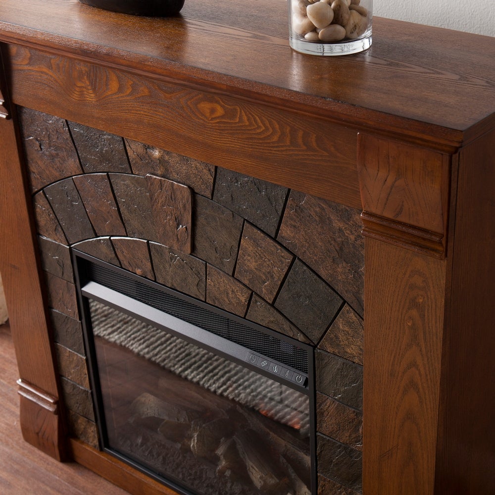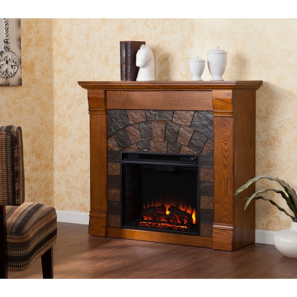Warm up your home with an antique oak electric fireplace. Featuring an oak finish and wood grain enhanced with aged distressing, each piece is 100 percent unique. With its faux slate detailing this fireplace would look classic and chic in your home.