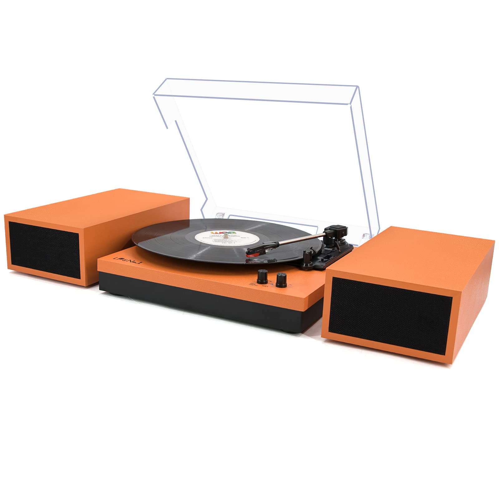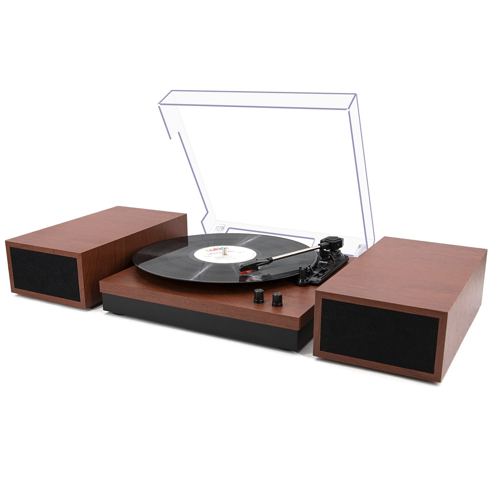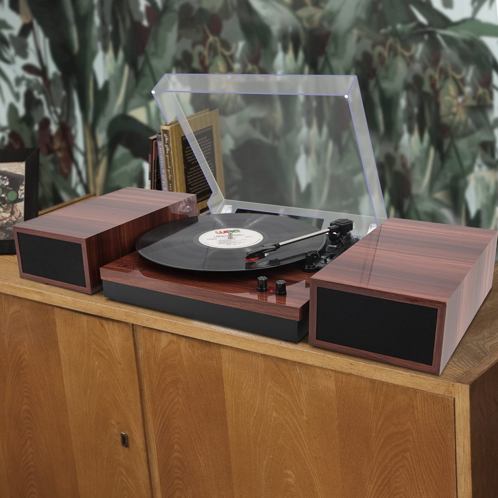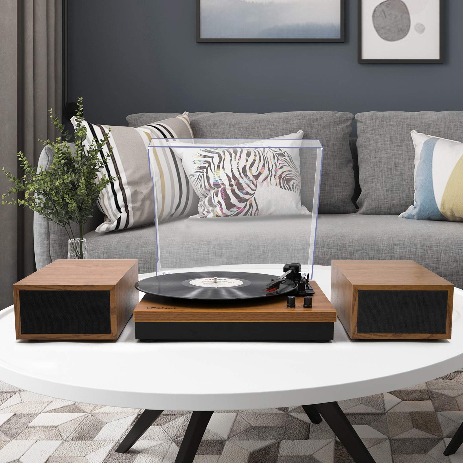 Bookshelf Speakers with Multiple Placement OptionsVarious flexible layouts to match your room and personal taste. You can position the speakers the way you want, which allows you to use your imagination to decorate your house, as they can serve as a support for vinyl or bookshelf. The plastic case covering fits over the player even with the records playing. It is also very fabulous and attractive furniture. |